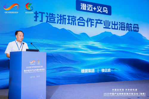 落地海南重要企业代表、楼厦集团董事长楼正武先生以《澄迈+义乌 打造浙琼合作产业出海航母》为主题,向各位参会嘉宾宣讲“两个百强县,同舟闯全球”的创新发展新脉络。楼厦集团在澄迈投资建设海南义乌企业总部基地项目,聚焦总部经济,吸引跨国公司与国内龙头企业设立区域总部或功能中心,形成“链主效应”,带动上下游企业配套布局。项目将系统性重构区域发展格局,推动高端制造、现代服务业与研发创新融合,致力成为海南自贸港创新引擎。